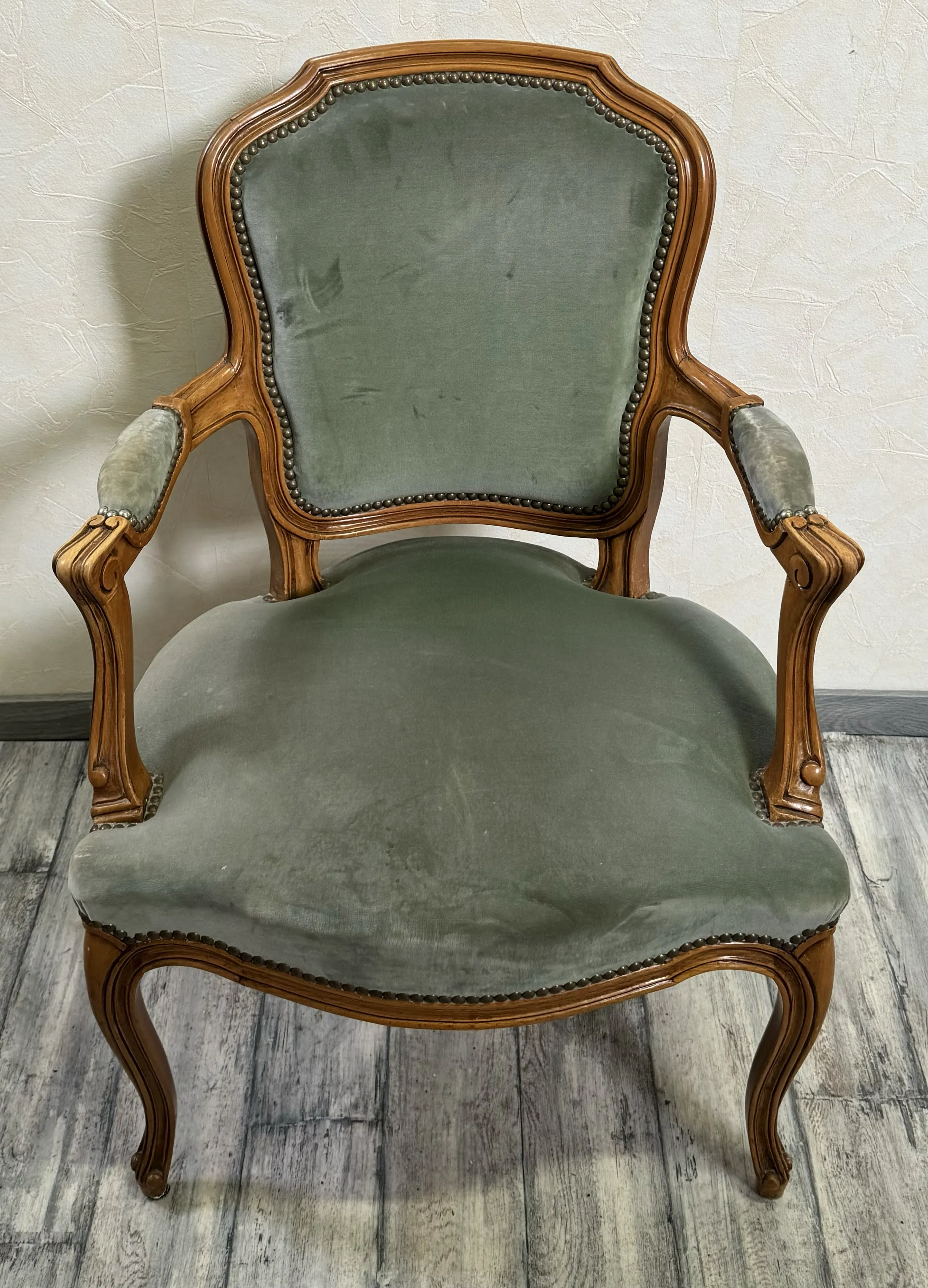 Fauteuil bergère vintage, au tissu à motifs et aux pieds en bois sculpté. Ce fauteuil confortable et élégant apportera une touche de charme ancien à votre salon ou chambre. Idéal pour les amateurs de mobilier classique et raffiné.